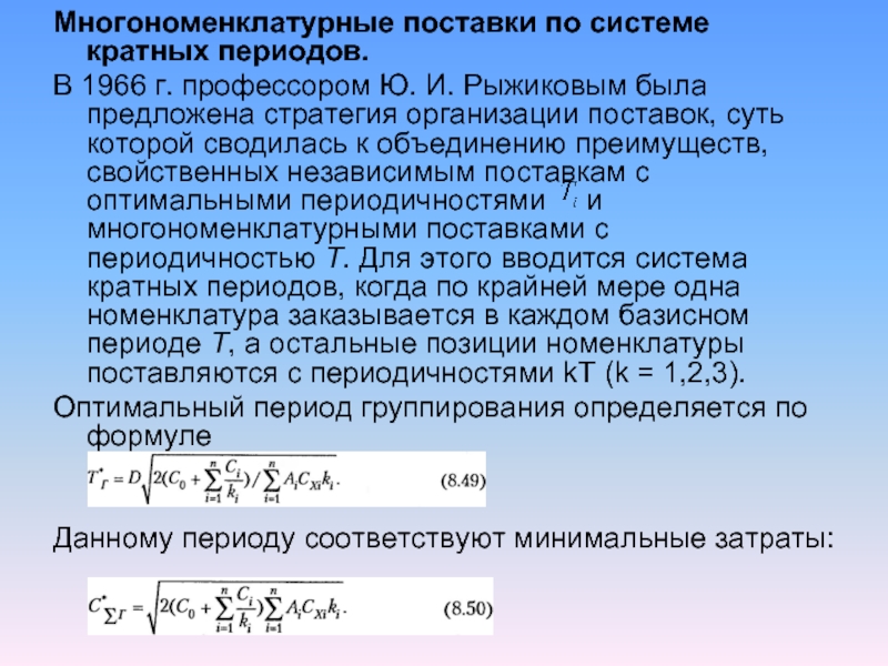 Рыжиковым была предложена стратегия организации поставок, суть которой сводилась к объединению преимуществ, свойственных независимым поставкам с оптимальными периодичностями и многономенклатурными поставками с периодичностью Т. Для этого вводится система кратных периодов, когда по крайней мере одна номенклатура заказывается в каждом базисном периоде Т, а остальные позиции номенклатуры поставляются с периодичностями kT (k = 1,2,3).