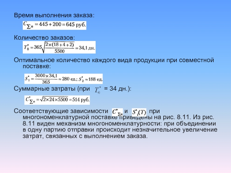 Соответствующие зависимости и при многономенклатурной поставке приведены на рис. 8.11. Из рис. 8.11 виден механизм многономенклатурности: при объединении в одну партию отправки происходит незначительное увеличение затрат, связанных с выполнением заказа.