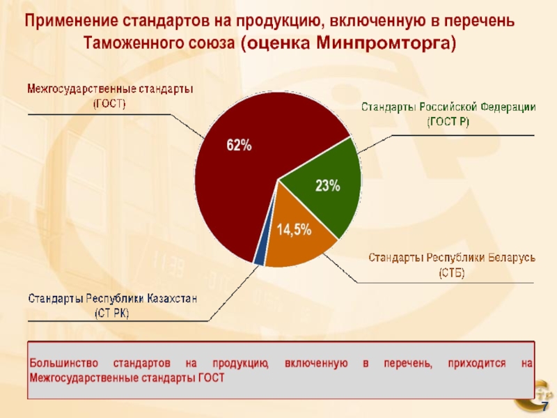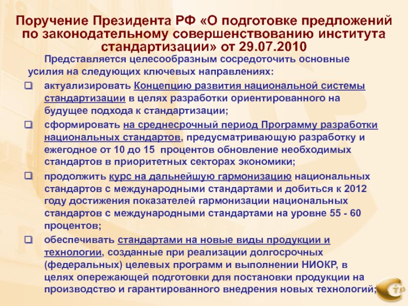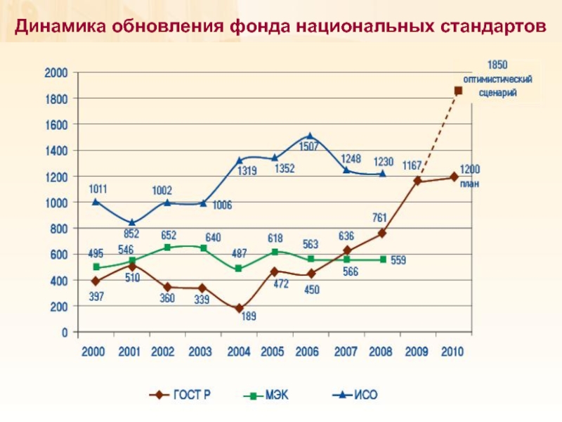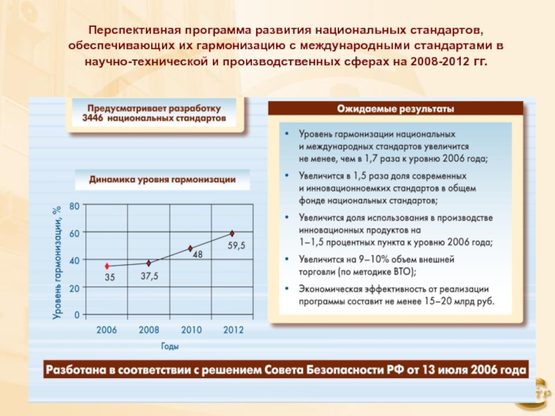 продолжить курс на дальнейшую гармонизацию национальных стандартов с международными стандартами и добиться к 2012 году достижения показателей гармонизации национальных стандартов с международными стандартами на уровне 55 - 60 процентов;