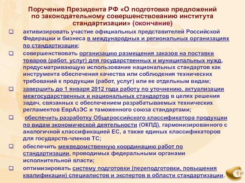оптимизировать систему подготовки (переподготовки, повышения квалификации) специалистов и экспертов в области стандартизации.