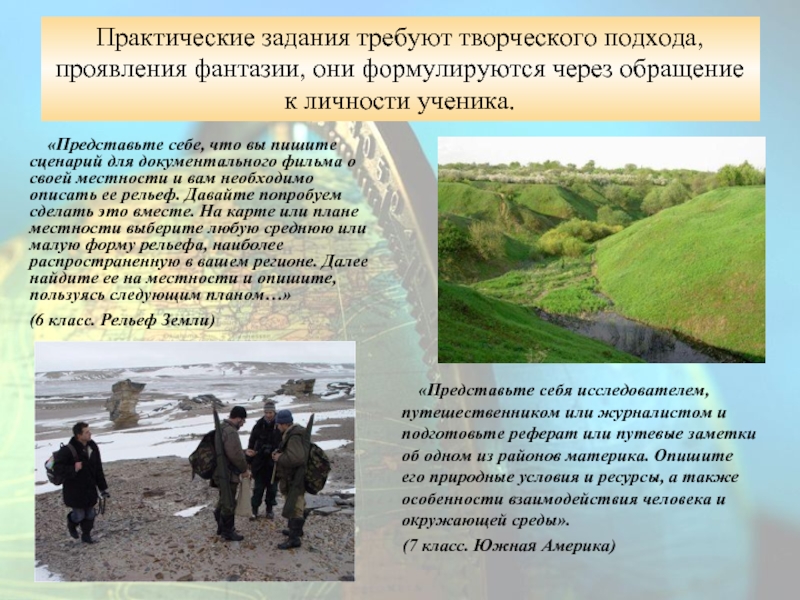 «Представьте себя исследователем, путешественником или журналистом и подготовьте реферат или путевые заметки об одном из районов материка. Опишите его природные условия и ресурсы, а также особенности взаимодействия человека и окружающей среды».
