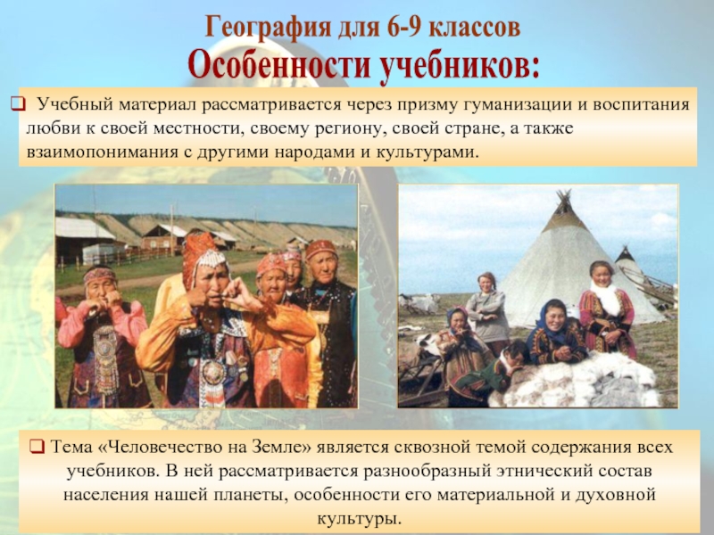 Тема «Человечество на Земле» является сквозной темой содержания всех учебников. В ней рассматривается разнообразный этнический состав населения нашей планеты, особенности его материальной и духовной культуры.