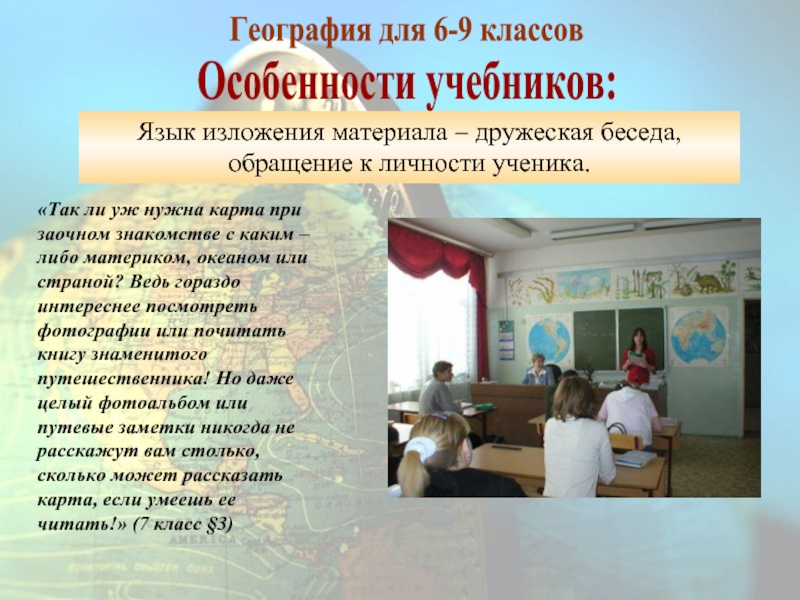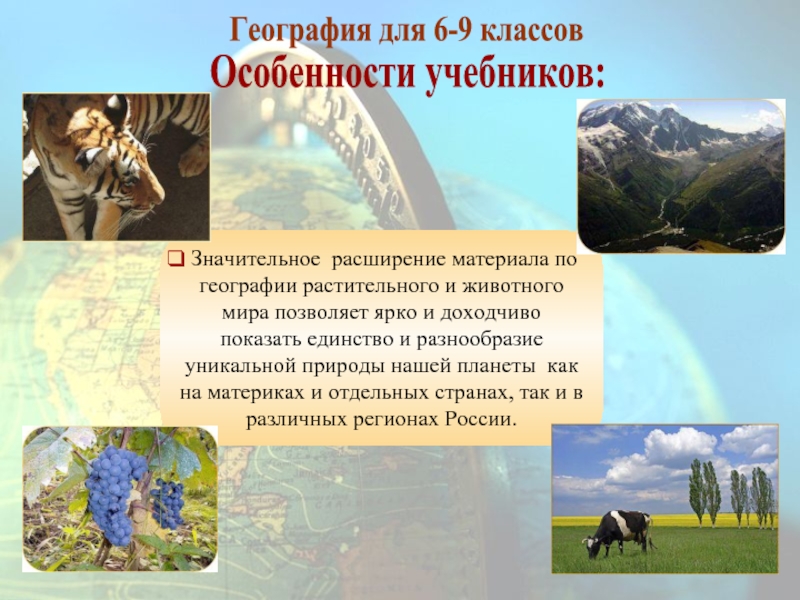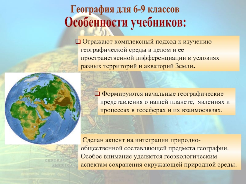 Сделан акцент на интеграции природно-общественной составляющей предмета географии. Особое внимание уделяется геоэкологическим аспектам сохранения окружающей природной среды.