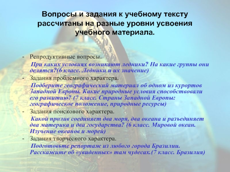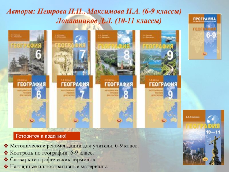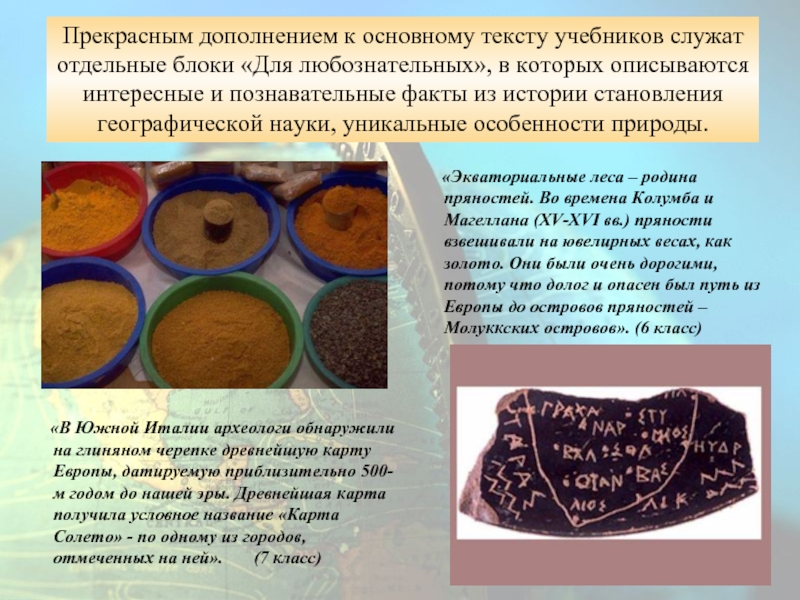 Прекрасным дополнением к основному тексту учебников служат отдельные блоки «Для любознательных», в которых описываются интересные и познавательные факты из истории становления географической науки, уникальные особенности природы.
