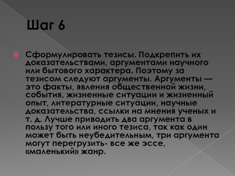 Поэтому за тезисом следуют аргументы. Аргументы — это факты, явления общественной жизни, события, жизненные ситуации и жизненный опыт, литературные ситуации, научные доказательства, ссылки на мнения ученых и т. д. Лучше приводить два аргумента в пользу того или иного тезиса, так как один может быть неубедительным, три аргумента могут перегрузить- все же эссе, «маленький» жанр.