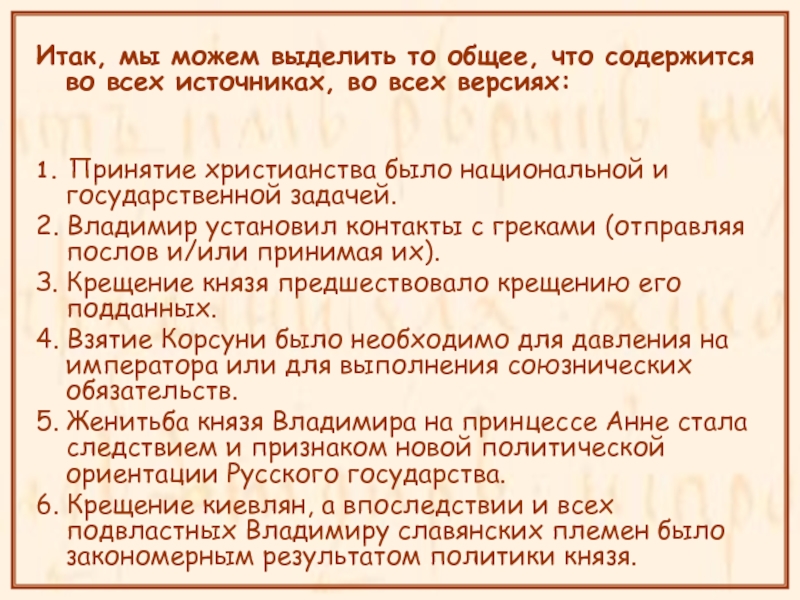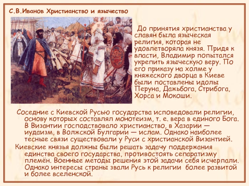 Киевские князья должны были решать задачу поддержания единства своего государства, противостоять сепаратизму племён. Военные методы решения этой задачи себя исчерпали. Однако интересы страны звали Русь к религии более развитой и более вселенской.