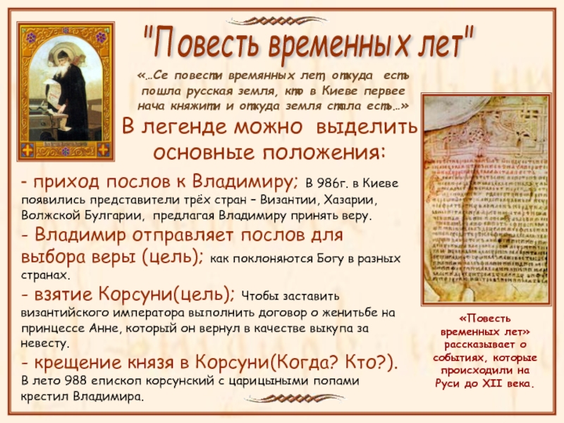 «Повесть временных лет» рассказывает о событиях, которые происходили на Руси до XII века.