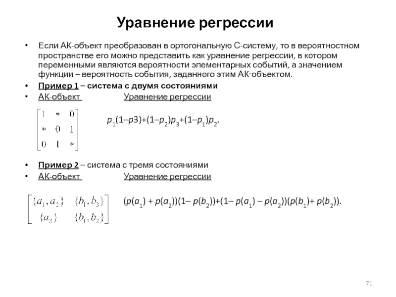 его можно представить как уравнение регрессии, в котором переменными являются вероятности элементарных событий, а значением функции – вероятность события, заданного этим АК‑объектом.
