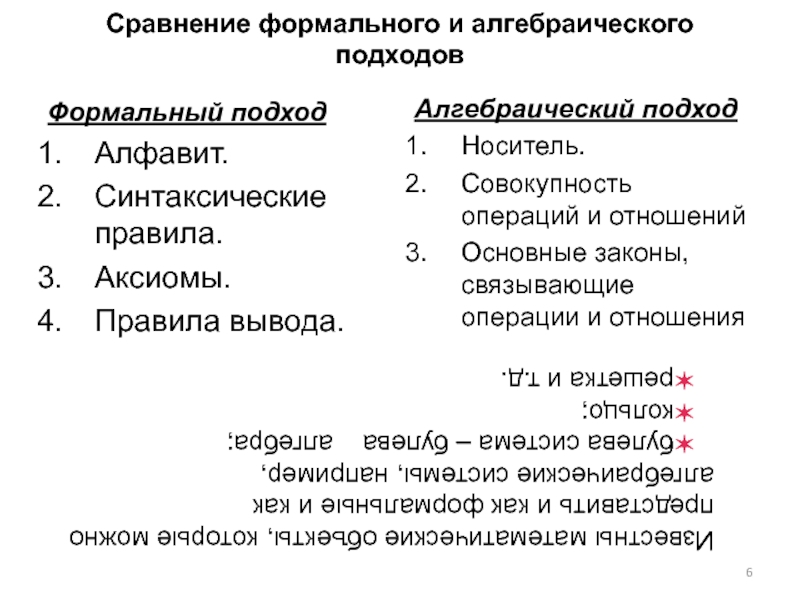 Слайд 6Сравнение формального и алгебраического подходов