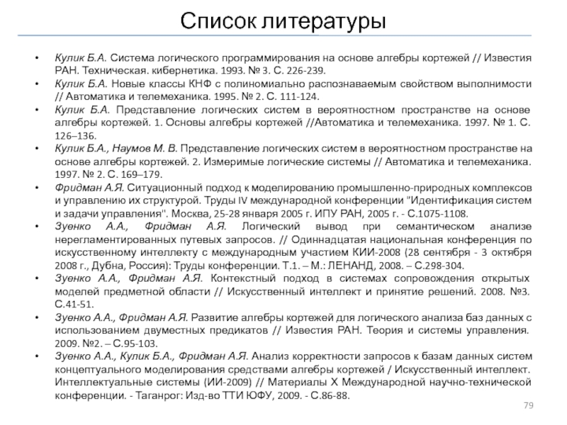 Кулик Б.А. Представление логических систем в вероятностном пространстве на основе алгебры кортежей. 1. Основы алгебры кортежей //Автоматика и телемеханика. 1997. № 1. С. 126–136.