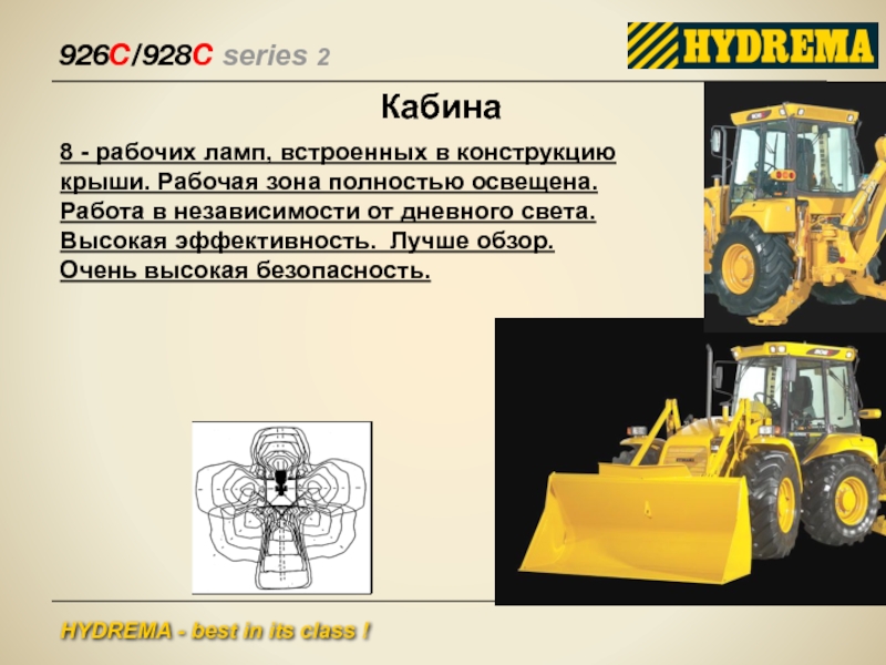 Кабина:- 4-опорная подвеска кабины- Низкий уровень шума- Мощное рабочее освещение на уровне крыши