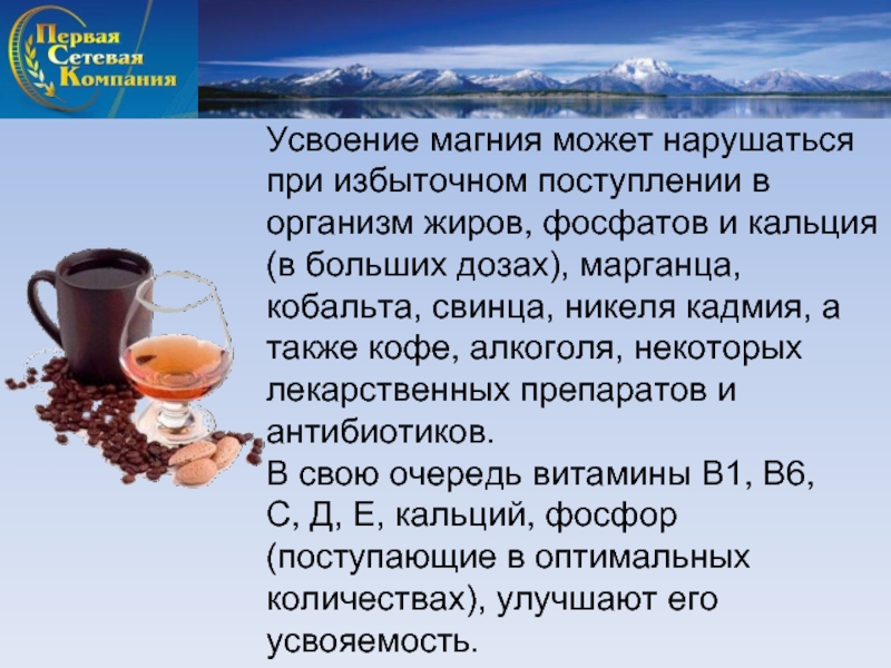 Слайд 5Магний влияет на усвоение витаминов группы В и кальция, важен для
