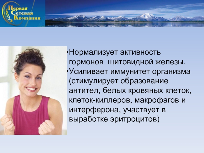 Слайд 26Нормализует активность гормонов щитовидной железы.
