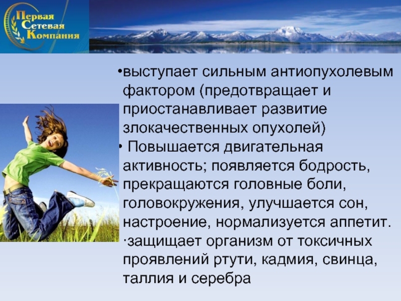 двигательная активность; появляется бодрость, прекращаются головные боли, головокружения, улучшается сон, настроение, нормализуется аппетит. ∙защищает организм от токсичных проявлений ртути, кадмия, свинца, таллия и серебра