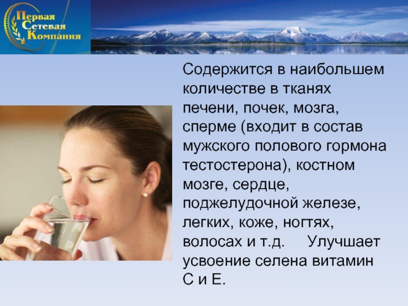 Слайд 27Содержится в наибольшем количестве в тканях печени, почек, мозга, сперме (входит