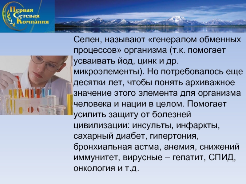 и др.микроэлементы). Но потребовалось еще десятки лет, чтобы понять архиважное значение этого элемента для организма человека и нации в целом. Помогает усилить защиту от болезней цивилизации: инсульты, инфаркты, сахарный диабет, гипертония, бронхиальная астма, анемия, снижений иммунитет, вирусные – гепатит, СПИД, онкология и т.д.
