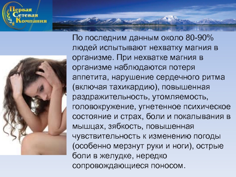 Слайд 16По последним данным около 80-90% людей испытывают нехватку магния в организме.