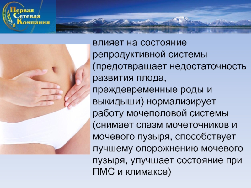 Слайд 8влияет на состояние репродуктивной системы (предотвращает недостаточность развития плода, преждевременные роды