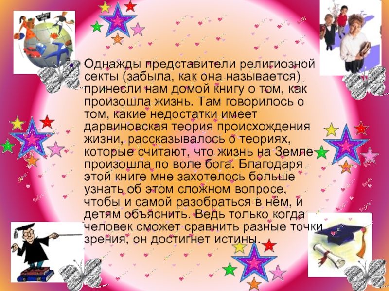 книгу о том, как произошла жизнь. Там говорилось о том, какие недостатки имеет дарвиновская теория происхождения жизни, рассказывалось о теориях, которые считают, что жизнь на Земле произошла по воле бога. Благодаря этой книге мне захотелось больше узнать об этом сложном вопросе, чтобы и самой разобраться в нём, и детям объяснить. Ведь только когда человек сможет сравнить разные точки зрения, он достигнет истины.