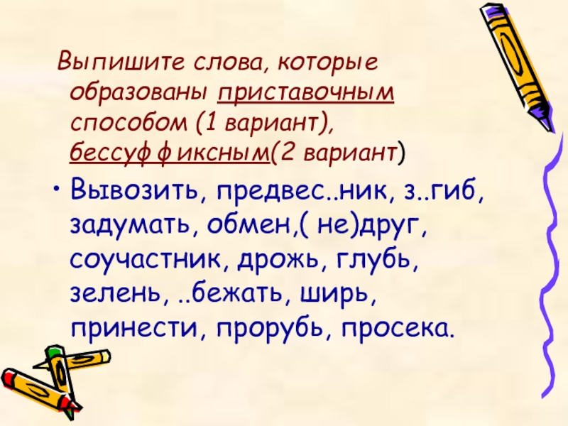 Выпишите слова, которые образованы приставочным способом (1 вариант), бессуффиксным(2 вариант)