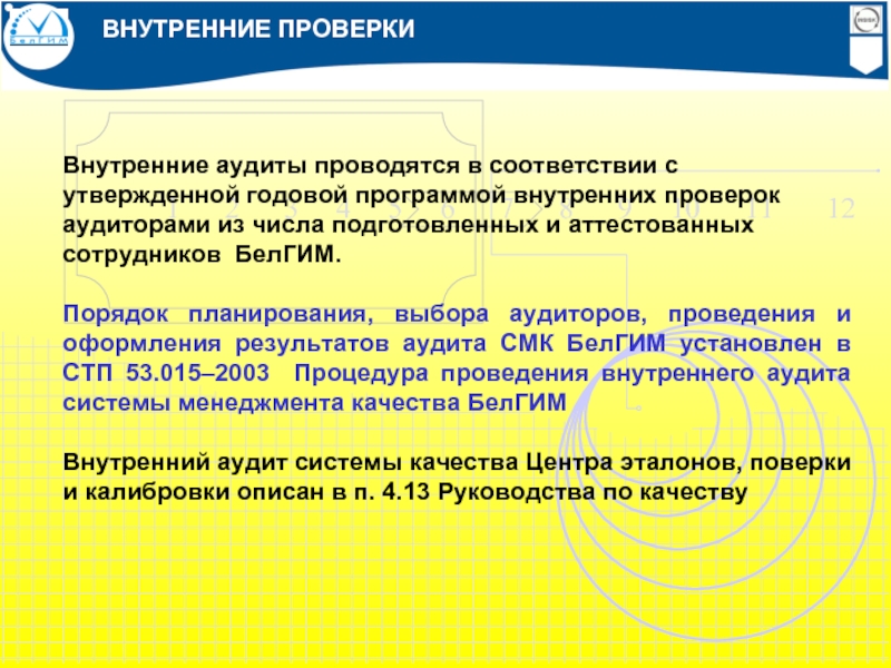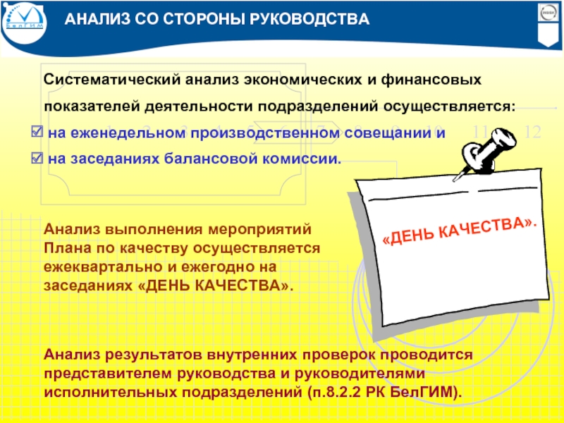 Анализ результатов внутренних проверок проводится представителем руководства и руководителями исполнительных подразделений (п.8.2.2 РК БелГИМ).