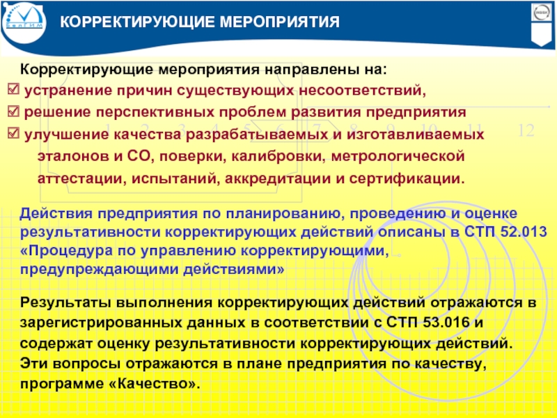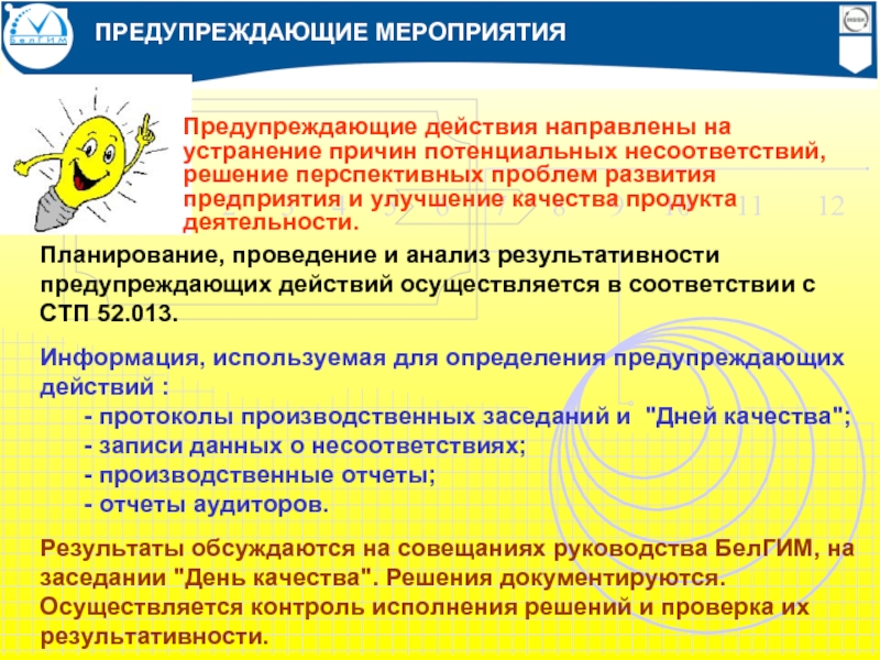 Предупреждающие действия направлены на устранение причин потенциальных несоответствий, решение перспективных проблем развития предприятия и улучшение качества продукта деятельности.