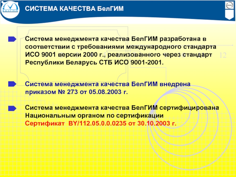 Система менеджмента качества БелГИМ внедрена приказом № 273 от 05.08.2003 г.