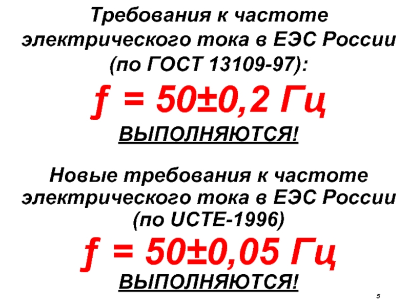 Новые требования к частоте электрического тока в ЕЭС России (по UCTE-1996)                     ƒ = 50±0,05 Гц ВЫПОЛНЯЮТСЯ!