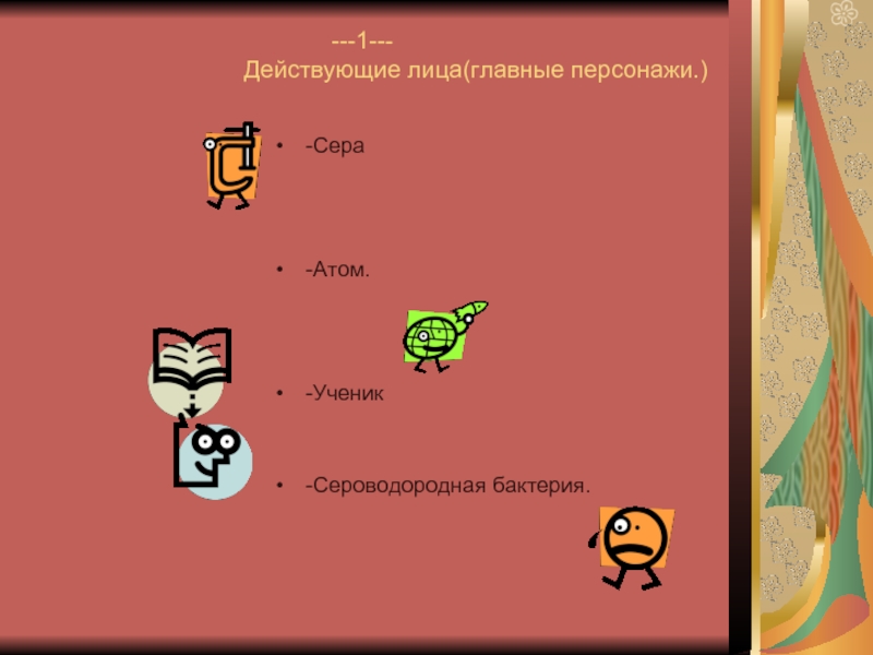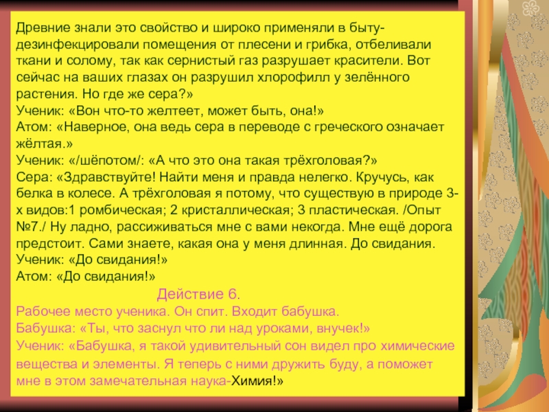 Квартира, рабочее место ученика. Ученик садится делать урок по химии. Открывает учебник читает рассуждает в слух: «Ну что же это за элемент такой – сера? В реакции с водородом ведёт себя как окислитель, а с кислородом – как восстановитель. Поступает как хамелеон. Ей шуточки, а мне всё это нужно запомнить? Безобразие!» Читает дальше. Кладёт руки и голову на стол /звучит лёгкая музыка он засыпает   / И снится ему сон….