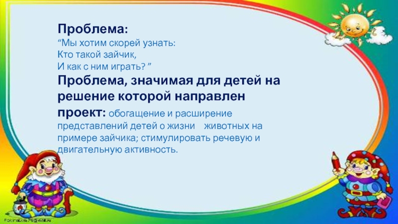 значимая для детей на решение которой направлен проект: обогащение и расширение представлений детей о жизни  животных на примере зайчика; стимулировать речевую и двигательную активность.