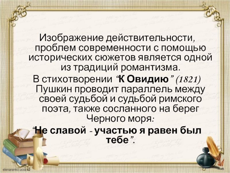 В стихотворении “К Овидию” (1821) Пушкин проводит параллель между своей судьбой и судьбой римского поэта, также сосланного на берег Черного моря: