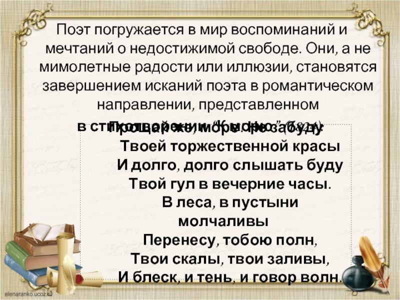 Слайд 10 Поэт погружается в мир воспоминаний и мечтаний о недостижимой свободе. Они,