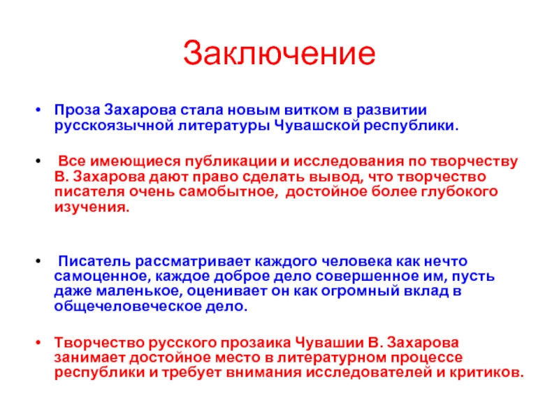 Творчество русского прозаика Чувашии В. Захарова занимает достойное место в литературном процессе республики и требует внимания исследователей и критиков.
