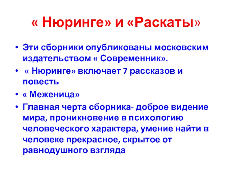 Главная черта сборника- доброе видение мира, проникновение в психологию человеческого характера, умение найти в человеке прекрасное, скрытое от равнодушного взгляда