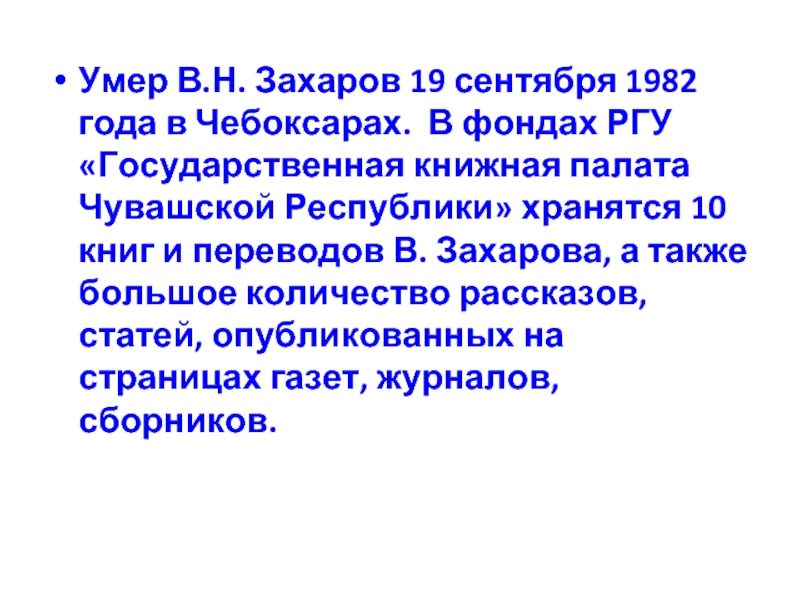 Слайд 9Умер В.Н. Захаров 19 сентября 1982 года в Чебоксарах. В фондах