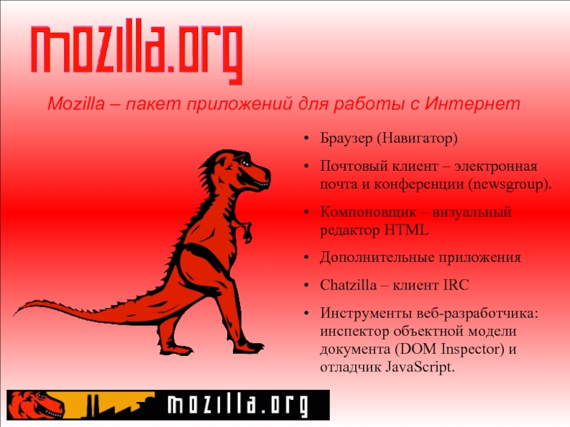 редактор HTML Дополнительные приложения Chatzilla – клиент IRC Инструменты веб-разработчика: инспектор объектной модели документа (DOM Inspector) и отладчик JavaScript.