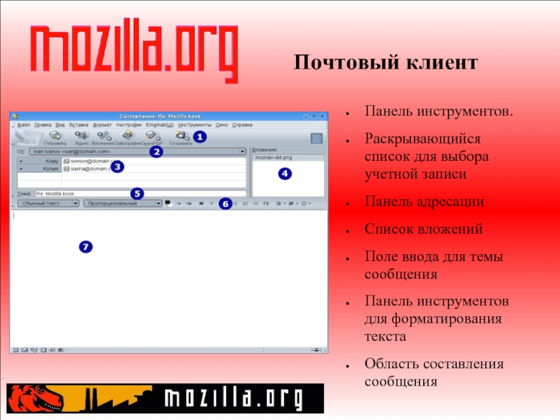 Слайд 9Почтовый клиент Панель инструментов. Раскрывающийся список для выбора учетной записи Панель адресации Список вложений Поле ввода