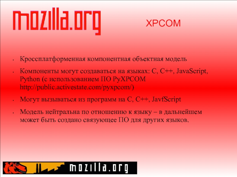 Слайд 19XPCOM Кроссплатформенная компонентная объектная модель Компоненты могут создаваться на языках: C, C++,