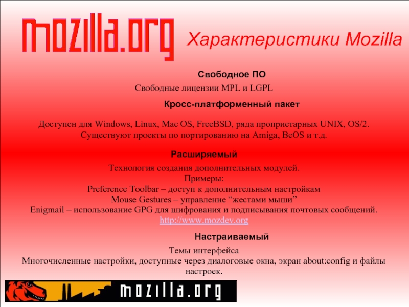 Слайд 3Характеристики Mozilla Свободное ПО Свободные лицензии MPL и LGPL Кросс-платформенный пакет Доступен для Windows, Linux,