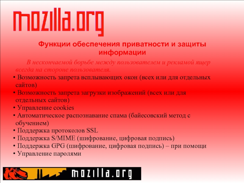рекламой ящер всегда на стороне пользователя. Возможность запрета всплывающих окон (всех или для отдельных сайтов) Возможность запрета загрузки изображений (всех или для отдельных сайтов) Управление cookies Автоматическое распознавание спама (байесовский метод с обучением) Поддержка протоколов SSL Поддержка S/MIME (шифрование, цифровая подпись) Поддержка GPG (шифрование, цифровая подпись) – при помощи Управление паролями