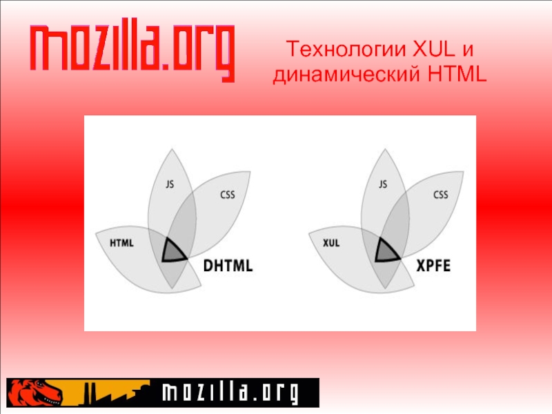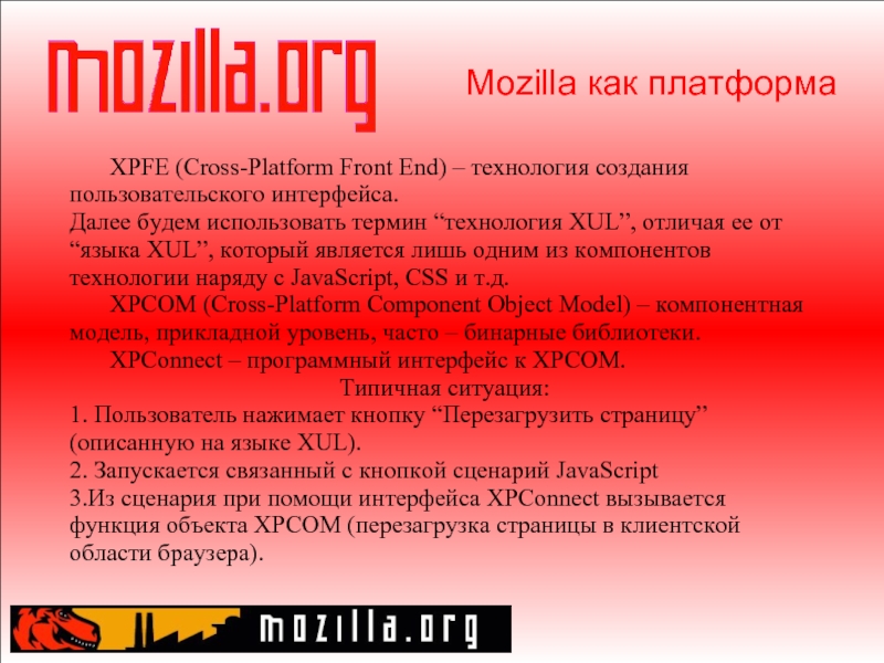 Слайд 13Mozilla как платформа XPFE (Cross-Platform Front End) – технология создания пользовательского интерфейса. Далее
