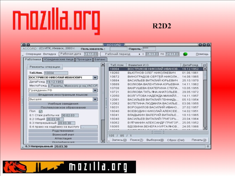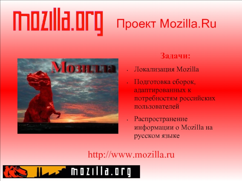 Слайд 24Проект Mozilla.Ru Задачи: Локализация Mozilla Подготовка сборок, адаптированных к потребностям российских пользователей Распространение информации о
