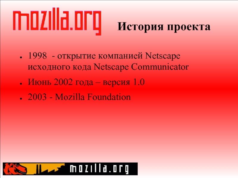 Слайд 12История проекта 1998 - открытие компанией Netscape исходного кода Netscape Communicator Июнь 2002