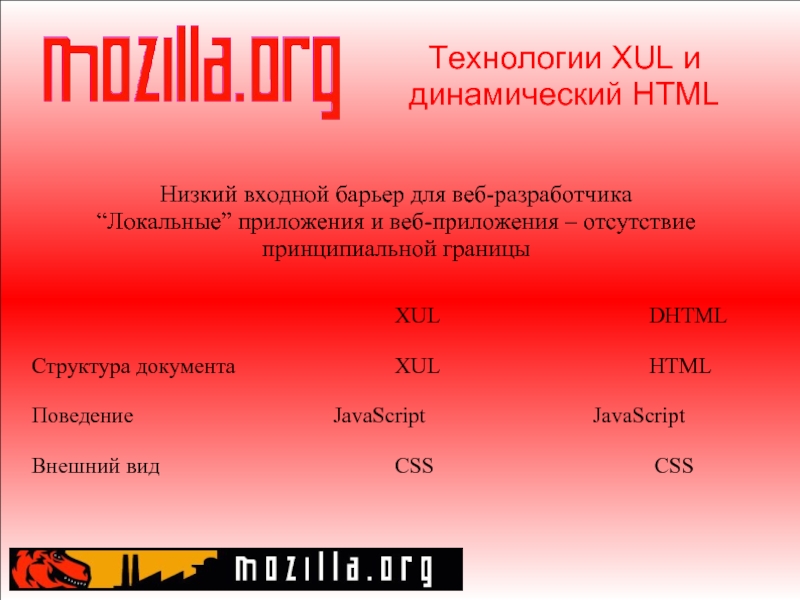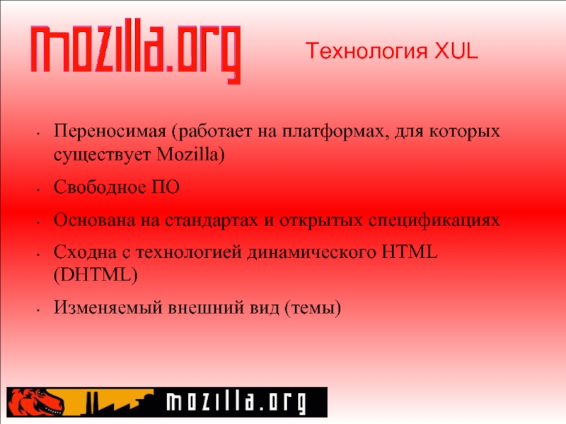 Слайд 14Технология XUL Переносимая (работает на платформах, для которых существует Mozilla) Свободное ПО Основана на