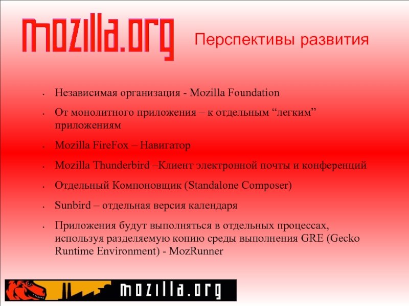 Слайд 23Перспективы развития Независимая организация - Mozilla Foundation От монолитного приложения – к отдельным