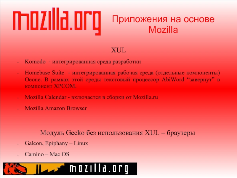 “легким” приложениям Mozilla FireFox – Навигатор Mozilla Thunderbird –Клиент электронной почты и конференций Отдельный Компоновщик (Standalone Composer) Sunbird – отдельная версия календаря Приложения будут выполняться в отдельных процессах, используя разделяемую копию среды выполнения GRE (Gecko Runtime Environment) - MozRunner