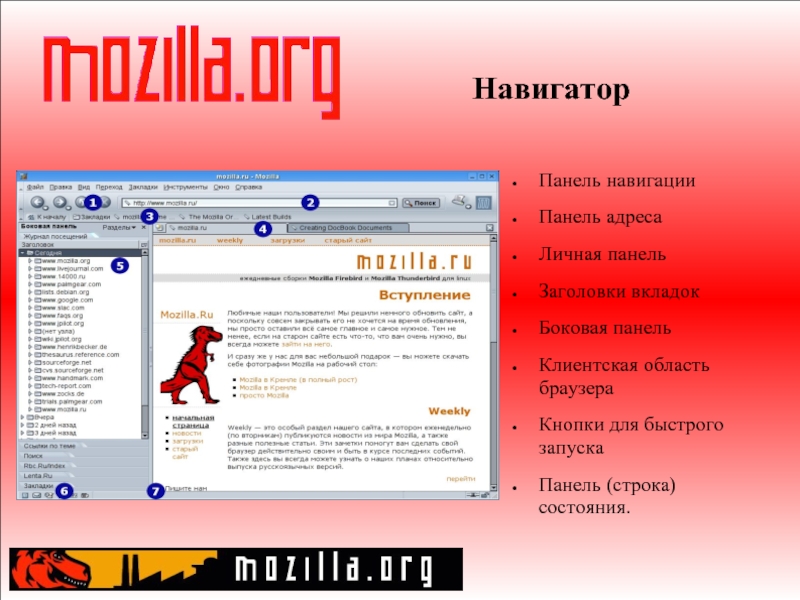 Слайд 7Навигатор Панель навигации Панель адреса Личная панель Заголовки вкладок Боковая панель Клиентская область браузера Кнопки для быстрого запуска Панель