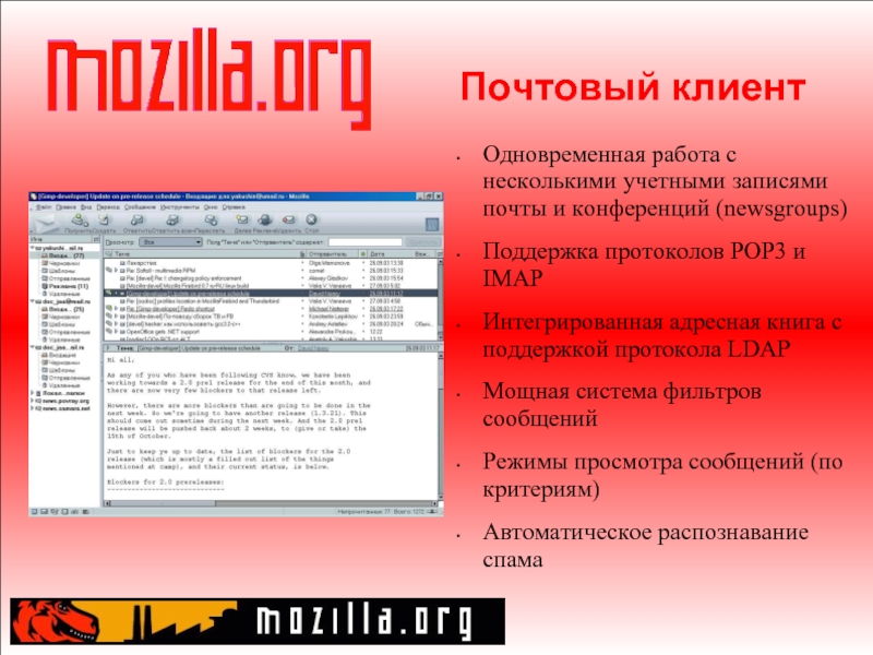 Слайд 8Почтовый клиент Одновременная работа с несколькими учетными записями почты и конференций (newsgroups) Поддержка