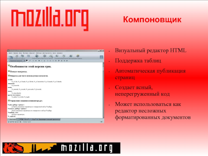 Слайд 10Компоновщик Визуальный редактор HTML Поддержка таблиц Автоматическая публикация страниц Создает ясный, неперегруженный код Может использоваться как