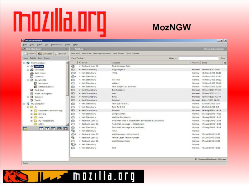 Mac OS, FreeBSD, ряда проприетарных UNIX, OS/2. Существуют проекты по портированию на Amiga, BeOS и т.д. Расширяемый Технология создания дополнительных модулей. Примеры: Preference Toolbar – доступ к дополнительным настройкам Mouse Gestures – управление “жестами мыши” Enigmail – использование GPG для шифрования и подписывания почтовых сообщений. http://www.mozdev.org Настраиваемый Темы интерфейса Многочисленные настройки, доступные через диалоговые окна, экран about:config и файлы настроек.